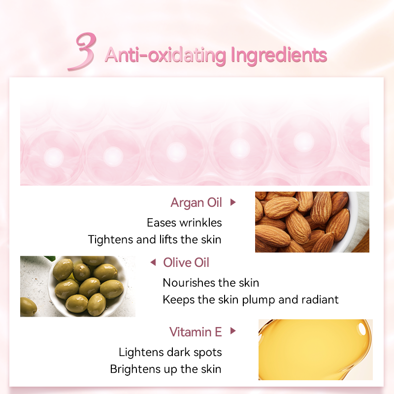 ● Mencergaskan kulit: diperkaya dengan asid amino yang berbeza, kulit diperkuat dengan pH seimbang yang menghalang pertumbuhan bakteria. Vitamin E adalah antioksidan yang berkesan yang melindungi kulit daripada tekanan luaran.